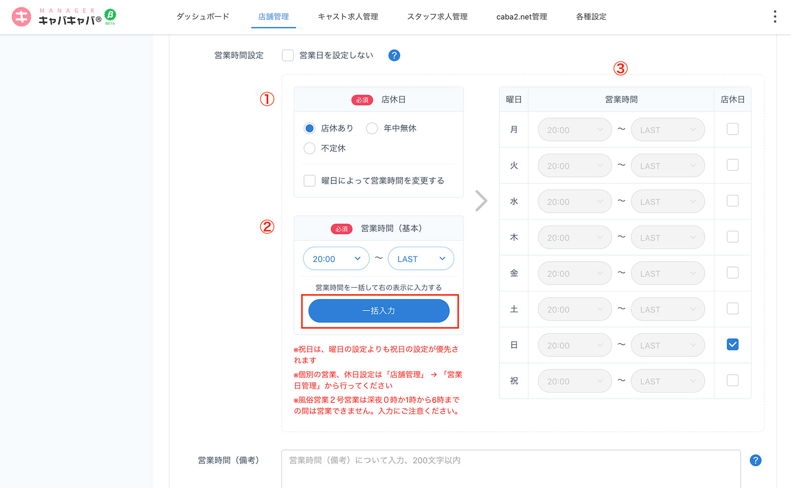 曜日ごとに営業時間が変わる場合は、③で曜日ごとに個別に営業時間をご入力ください③営業時間、店休日